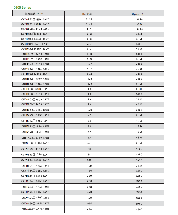 आकार: 0805 (2.0 * 1.2), बी मान: 3435,3450,3950,4200, 1%, 3%, 5% के परिशुद्धता कारक, इन उत्पादों को घरेलू उपकरणों, गर्म पानी के मीटर, वॉटर हीटर के लिए अत्यधिक गरम करने के लिए लागू किया जाता है, रेफ्रिजरेटर और प्रकाश व्यवस्था उत्पादों।