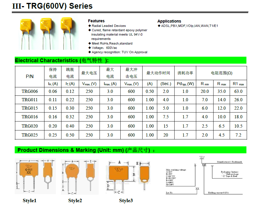 रेडियल लीड डिवाइस, ठीक, लौ retardant epoxy बहुलक, इन्सुलेट सामग्री उल 94v-0 आवश्यकताओं को पूरा करता है, रोह, पहुंच, मानक, वोल्टेज से मिलते हैं: 600vac, एजेंसी मान्यता: अनुमोदन पर tuv, इसके अलावा, इस उत्पाद उल प्रमाणीकरण, जो अधिक उपयोग में एक उत्पाद है। और इसका एक फायदा है मूल्य। यह मैन्युअल सोल्डरिंग को कम कर सकता है। निगम में अधिक वोल्टेज है उत्पादों। अगर आपको कोई समस्या है तो कृपया हमें ईमेल करें।