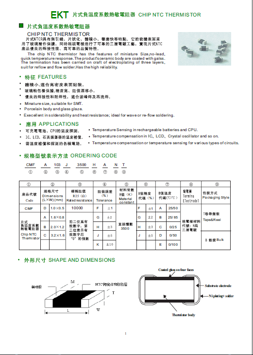 smd छोटे आकार के एनटीसी थर्मामीटर प्रतिरोध 0805 (2.0 * 1.2 के आकार में) ए के साथ 10k का प्रतिरोध मूल्य, 1% -5% के परिशुद्धता कारक, तापमान है वर्तमान में सबसे पारंपरिक प्रकार के मुआवजे उत्पाद। उत्पाद है -55 ℃ के एक ऑपरेटिंग तापमान के साथ मोटर वाहन इलेक्ट्रॉनिक्स पर लागू किया + 150 ℃। यह ऑटोमोबाइल स्तर पर लागू है। सतह थर्मिस्टर घुड़सवार प्रतिरोध पुराने प्लग-इन उत्पादों से सबसे अलग है जो यह कर सकता है मैन्युअल ऑपरेशन को कम करें और स्वचालित उत्पादन का विस्तार करें। इसे घुमाया जा सकता है एक छोटे आकार के साथ एक साफ और चिकनी तरीके से सतह। विस्तृत के लिए विभिन्न उत्पादों की जानकारी, कृपया निगम के उत्पाद को डाउनलोड करें दस्तावेजों।
